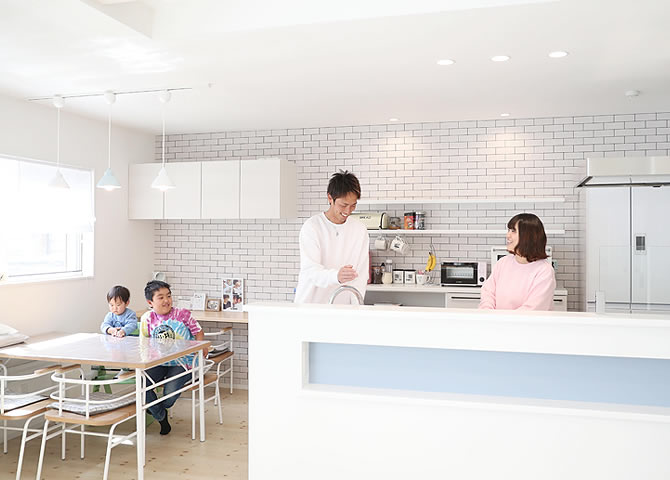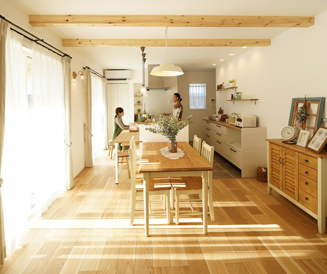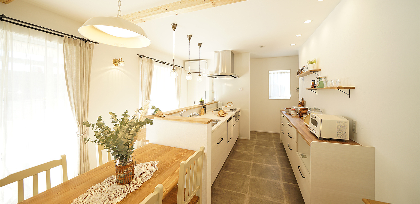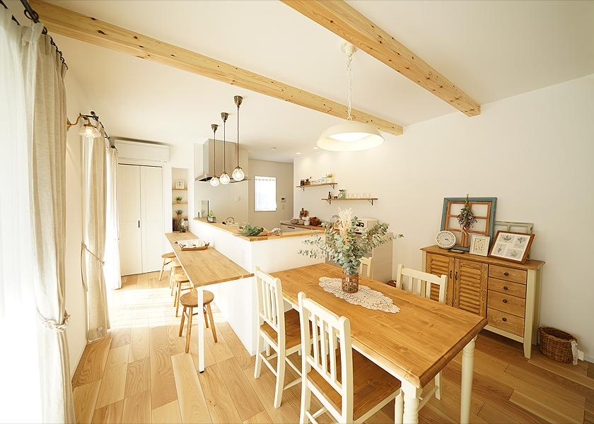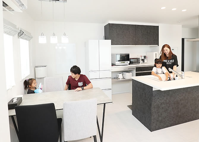 ぐるぐる回れる快適な家事導線と陽の光がいっぱい降り注ぐLDKで笑顔が絶えない家族にぴったりのお家に仕上がりました。キッチン横にダイニングテーブルを置いたことで、熱々の料理をすぐに運べて、お⽚付けもスムーズに。