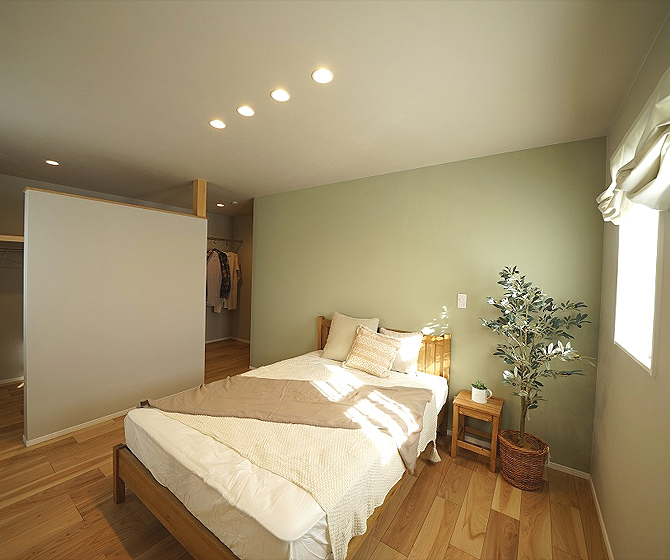 白い木目とグリーンの色合いでゆっくりと安らげる主寝室。