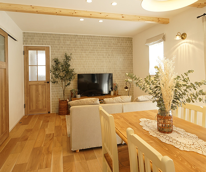 漆喰の塗り壁に、壁一面のやさしい色合いのアクセントタイルや見せ梁を設ける事で、存在感のある空間と奥行き感が出ています。