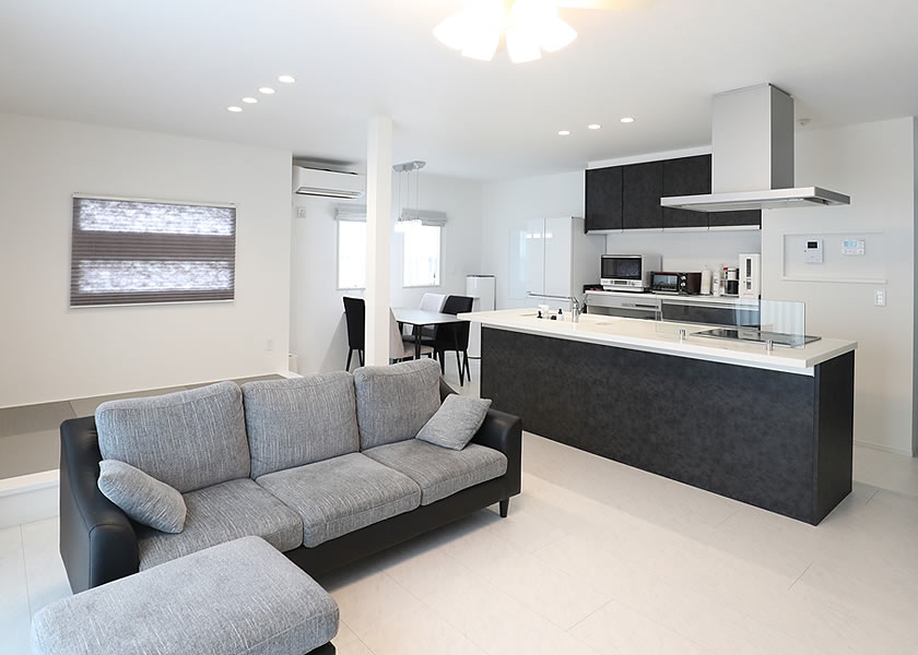 落ち着きのあるモノトーンのインテリアでモダンでシックな⼤⼈空間を演出しました。⼤⼝径窓で光を多く取り⼊れることで、より明るいリビングにしたり、シンプルな⾊合いで統⼀されスタイリッシュなキッチンスペースなどこだわりが詰まった場所です。