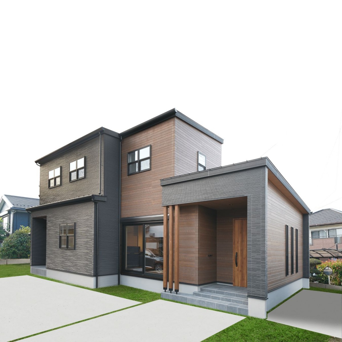 ブラックの外壁にアクセントで木目調を使ったスタイリッシュな外観