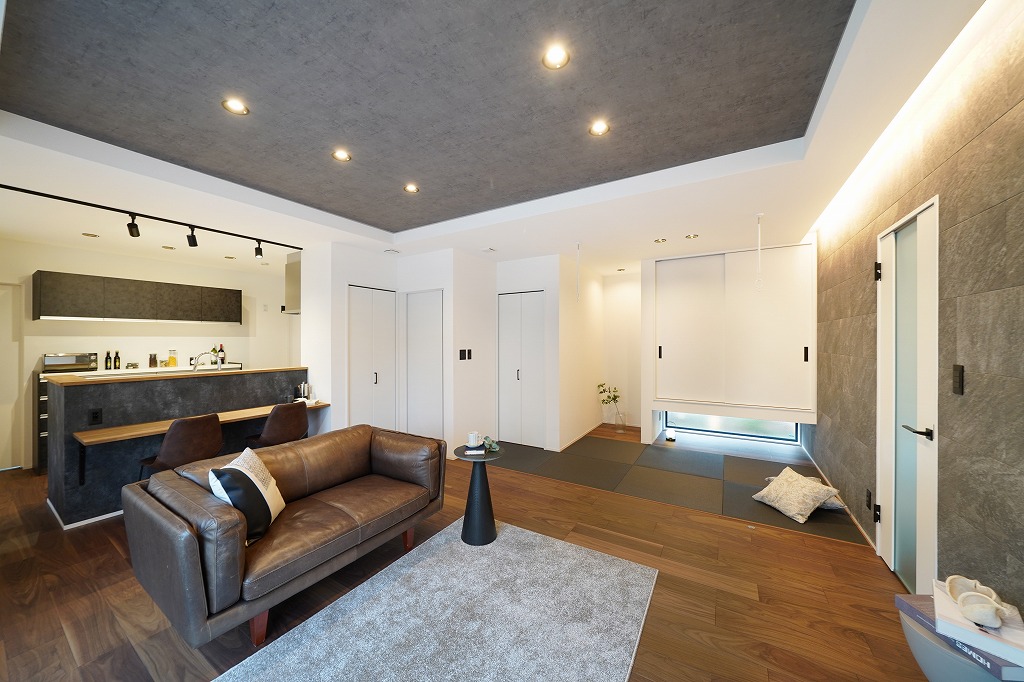 折り上げ天井とフラットなタタミコーナーで広さと高さを感じられるLDK