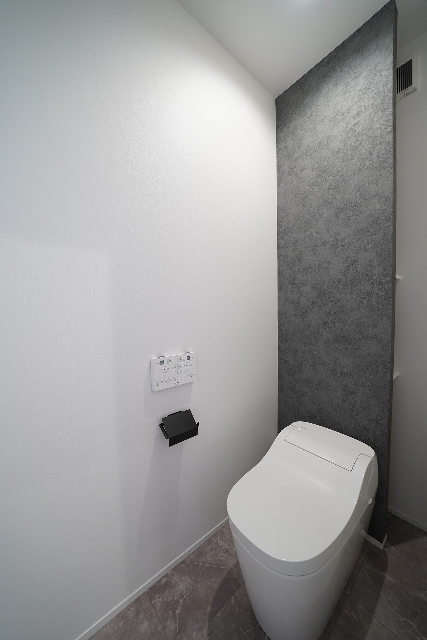 ホワイトの石目調の床材にブラックとグレーのインテリアでホテルライクな内観