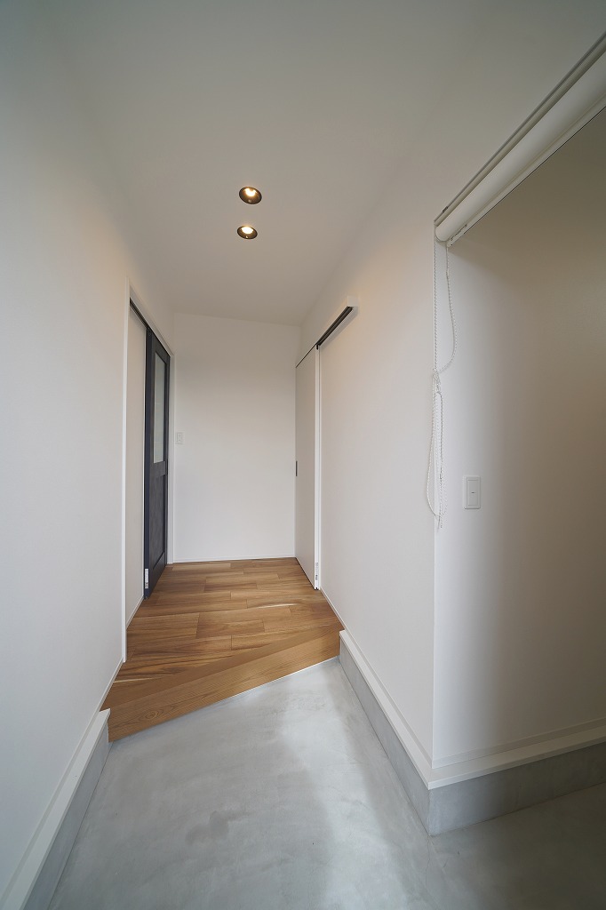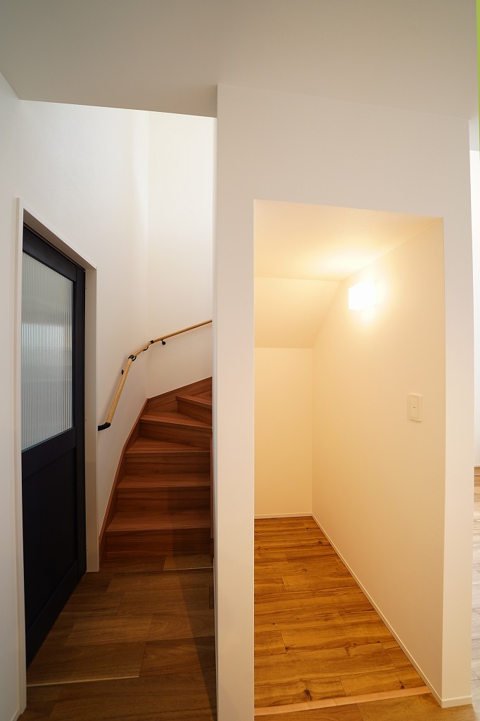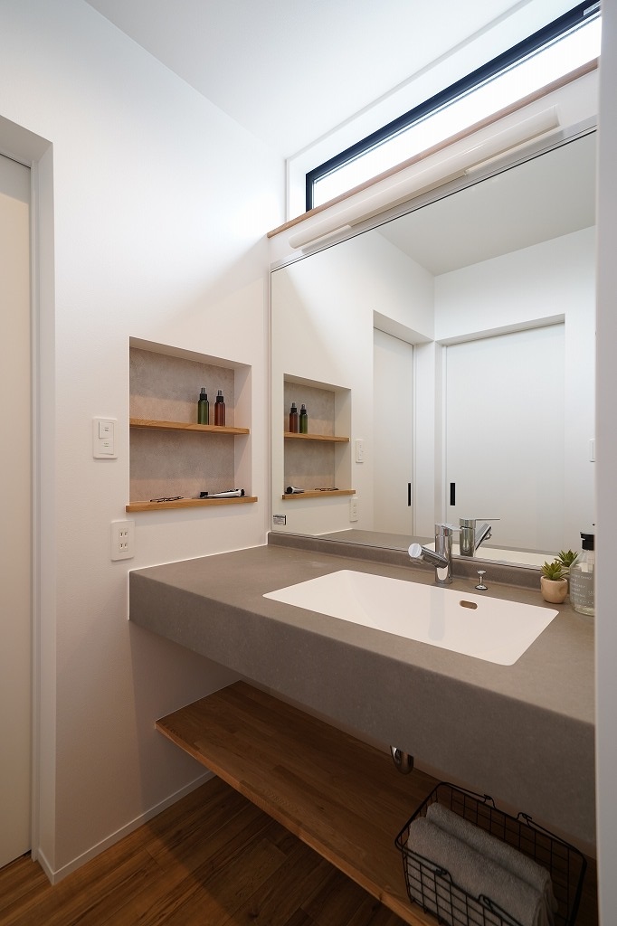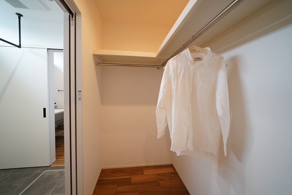 玄関フロアは右に行くと大容量のシューズクローク。上がって右に行くとリビング、左へ行くと洗面スペース&洗面脱衣所へ行くことができます。汚れて帰ってきてもリビングを通らず水まわりへ行ける衛生面もバッチリです。
