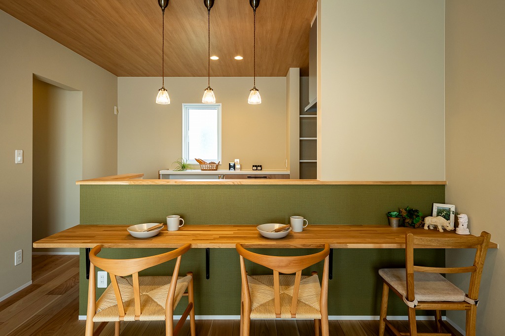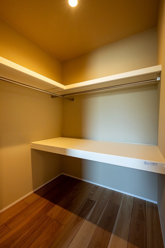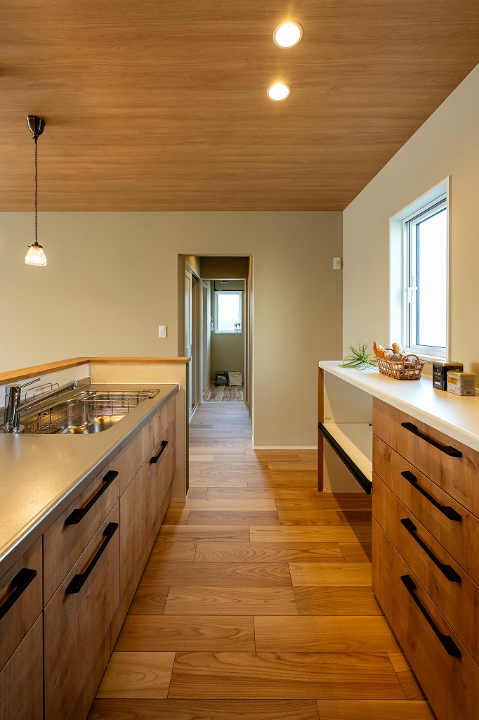 キッチンとカップボードの間を広く設けているので大人二人でも余裕をもって行き来できます。奥のドアの先はとファミリークロークと洗面脱衣所、お風呂、トイレの水回りコーナーへ行くことができます。キッチン・洗面脱衣所・浴室・トイレの水回りが近い家事楽動線