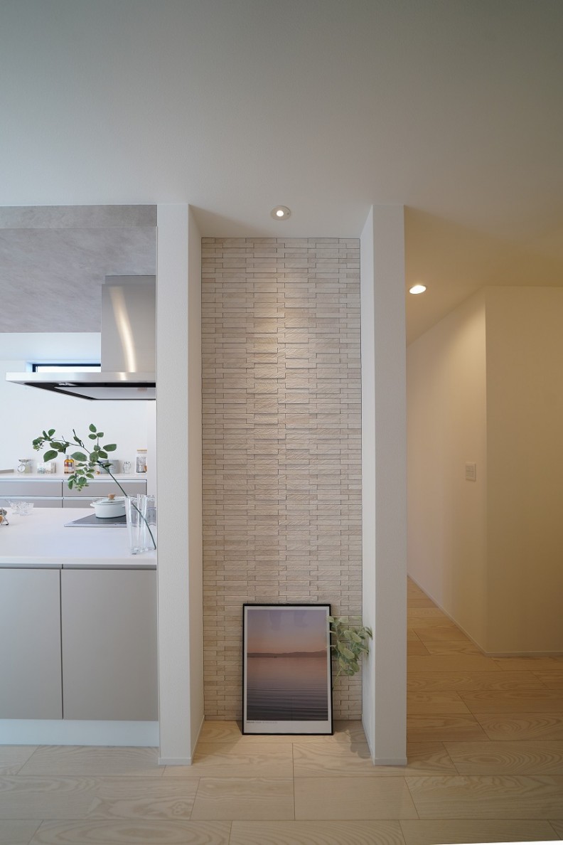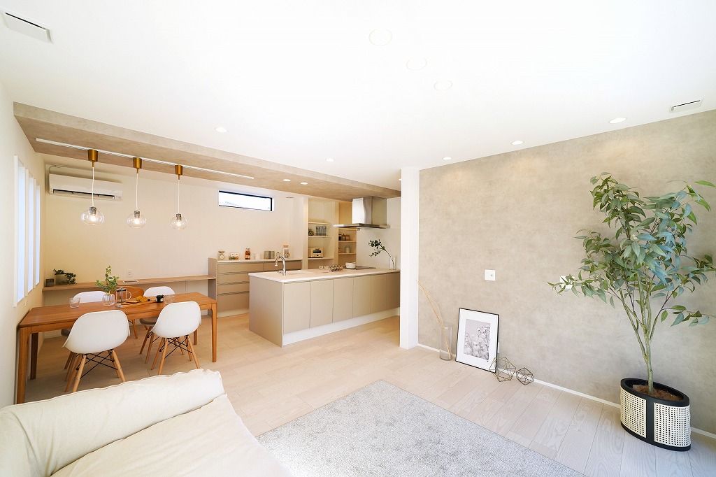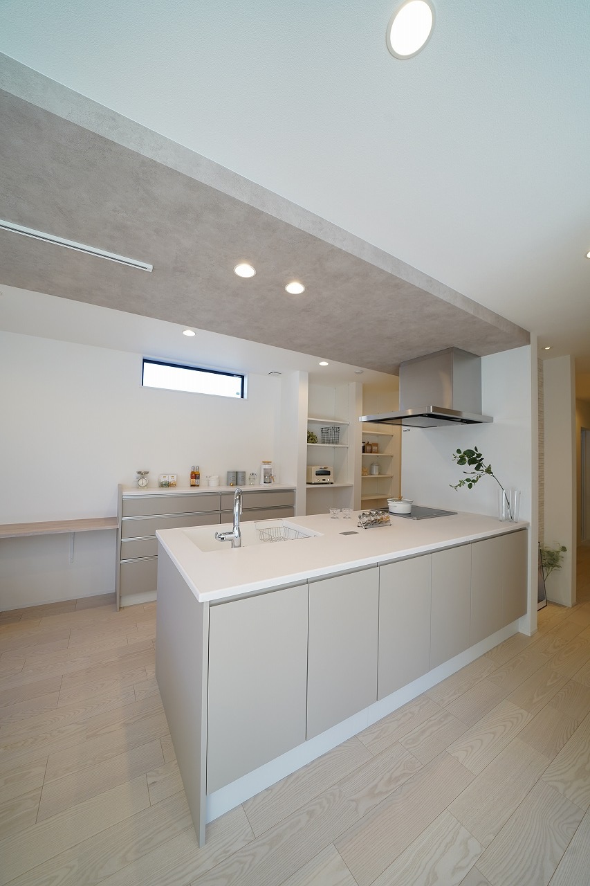 上質で落ち着いた雰囲気を演出したLDKにマットな質感のグレージュカラーを採用したスタイリッシュなキッチンスペース。