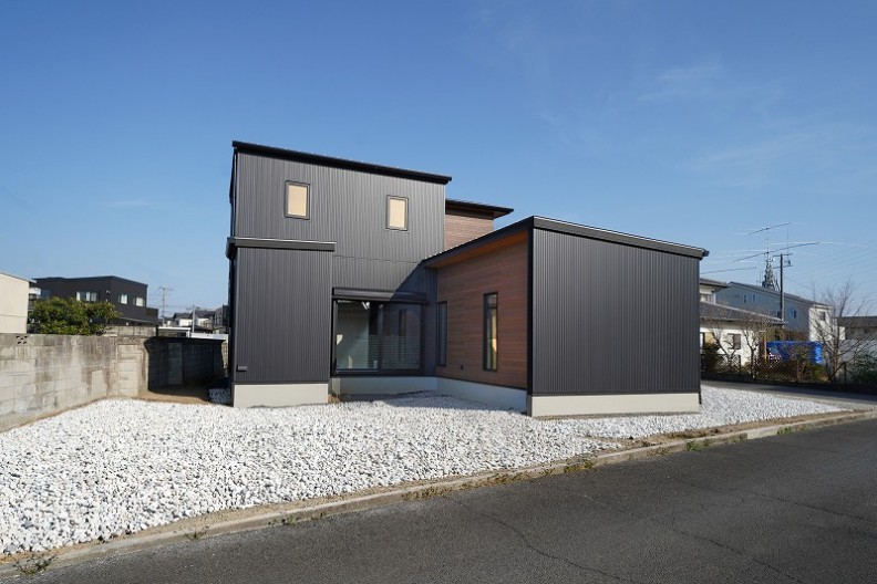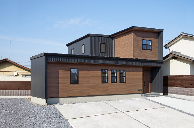 金属系サイディングのシアブラックをベースに、木目調のアクセントを効かせた外観。