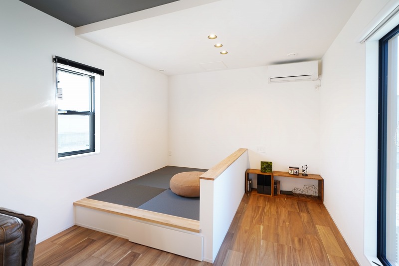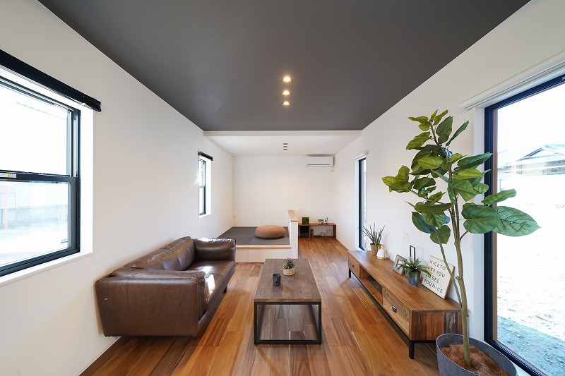 23帖の広々としたLDKには、アカシアの無垢床と墨染色の和紙畳がモダンに響き合う「小上がりコーナー」