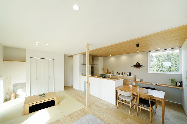 シンプルモダンの外観に白と木の風合いを基調した内観