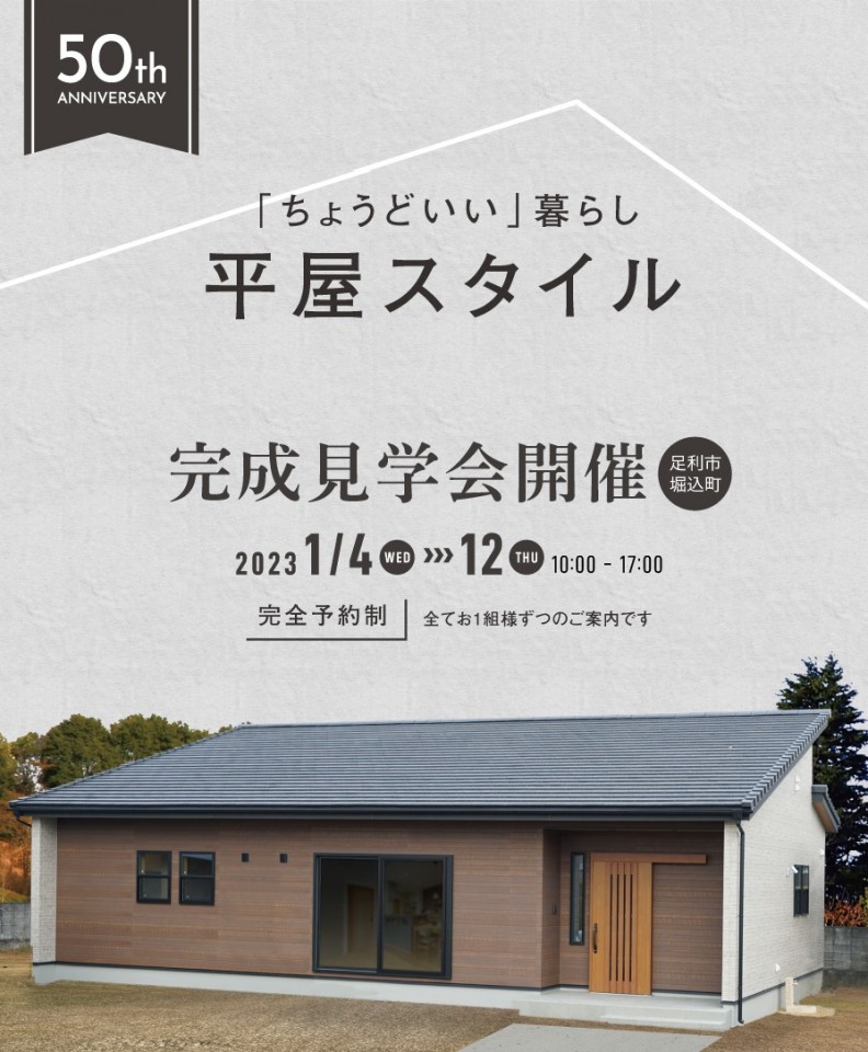 足利市堀込町で平屋の完成見学会を期間限定で開催します。
