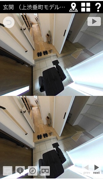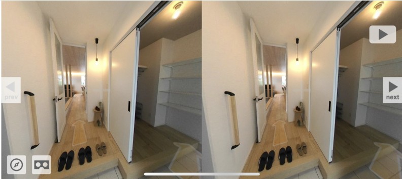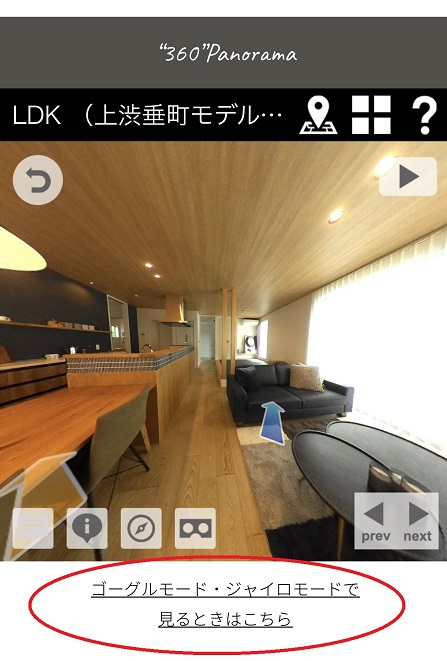 スマートフォンで360度パノラマの下に『ゴーグルモード・ジャイロモードで見る時はこちらを』をタップして「VRゴーグルモード」で表示させます。