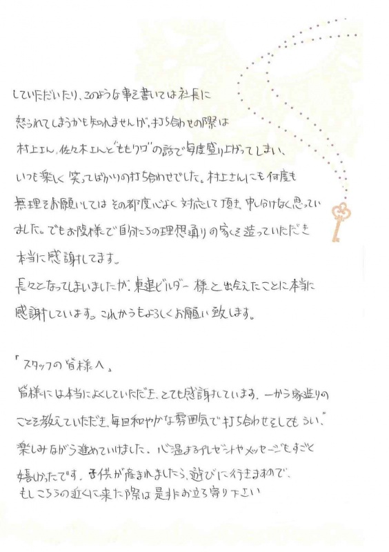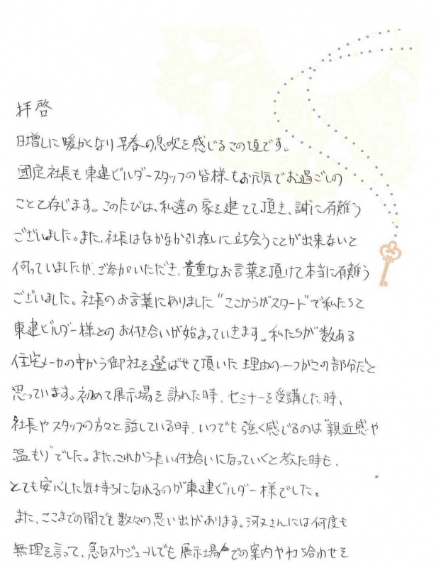 このたびは、私達の家を建てて頂き、誠に有難うござました。