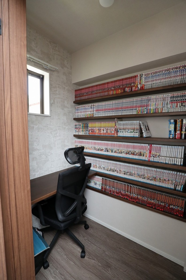 壁紙、照明などに定番、遊び、好みを家の中のどこかに必ず取り入れ、2Fホール共有スペースと趣味に没頭できる書斎など夫婦それぞれの希望を実現することがもできました。