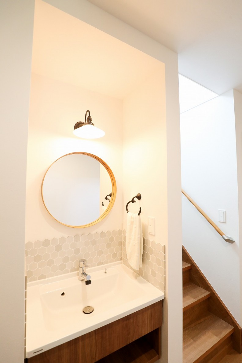 奥様:友人を家に呼ぶのが好きなので、家族はもちろん家族以外の人でもくつろげる空間にしたくて、玄関、リビングは広めに、1Fトイレ、洗面台はゲストが使うことを意識して使いやすさと見た目にこだわりました。