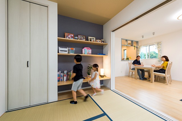 O様:和室に棚を設置して、子供がお絵かきや勉強をしたり、本棚として使ったりできるようにしました。