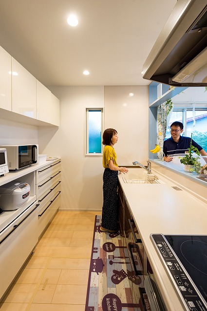 奥様:キッチンのカウンターの色を爽やかなブルーにして、お部屋のアクセントにしました。