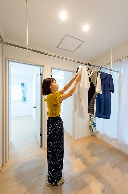 2階のホールに物干しスペースを作り、外出時やお天気の悪い時も洗濯が干せるようにしました。