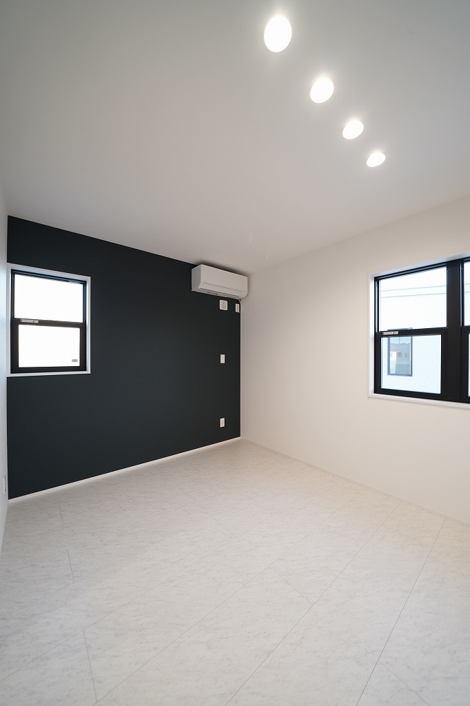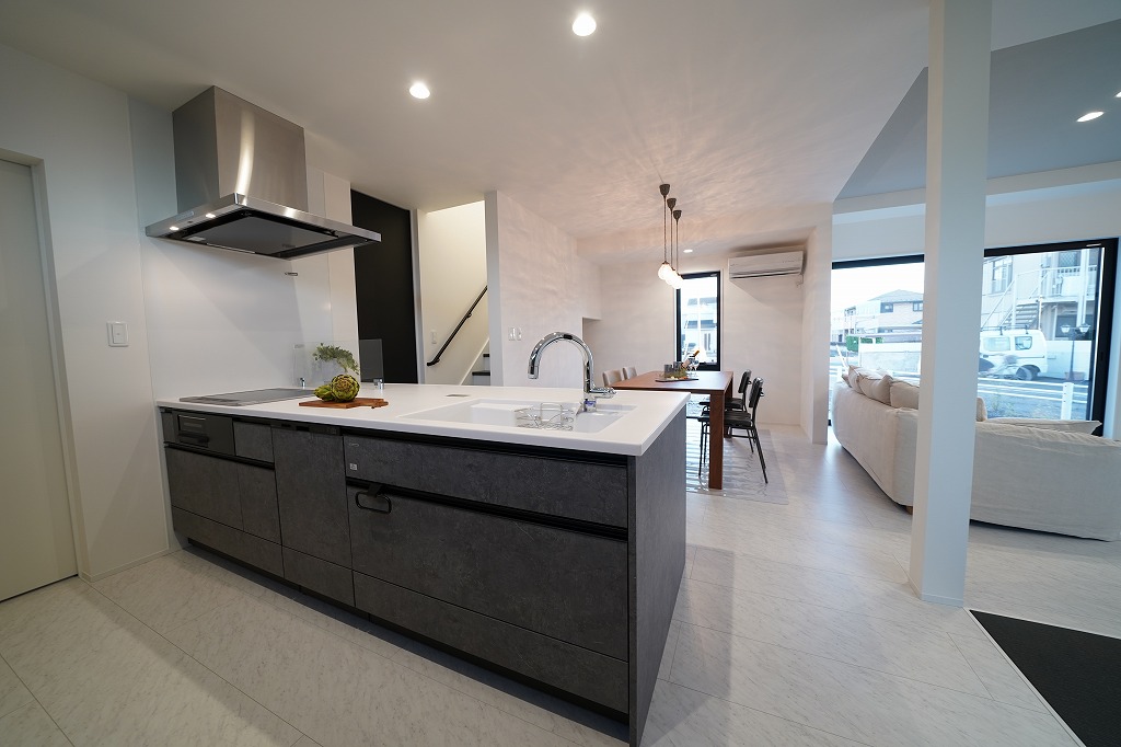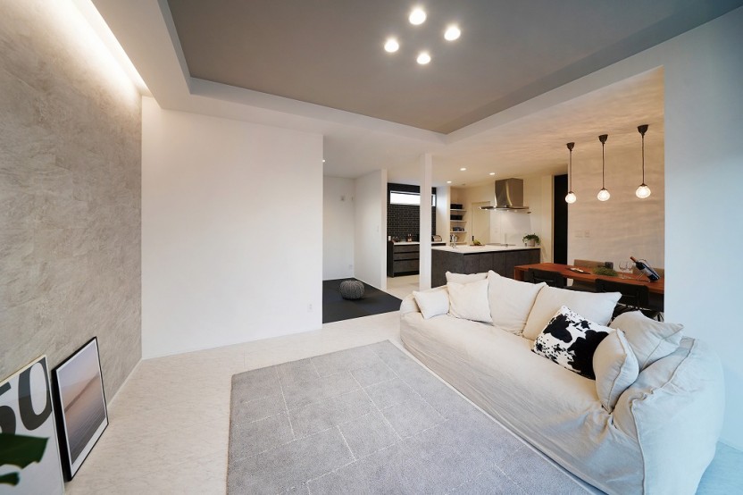 ホワイトの石目調の床材にブラックとグレーのインテリアでホテルライクな内観