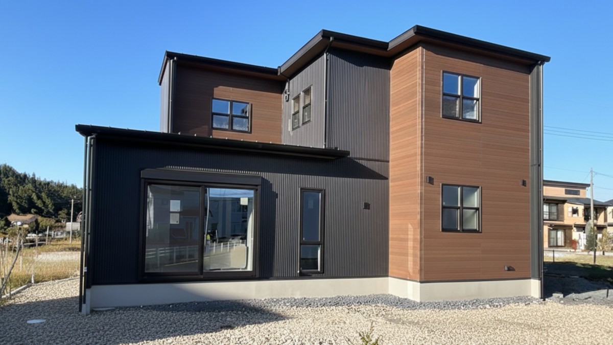 ブラックをメインにアクセントで木目調を使ったモダンな外観