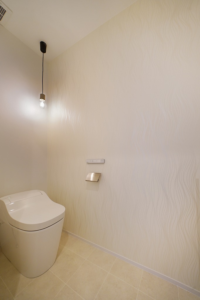 トイレにおしゃれなペンダントライトを吊すことで、一気に魅力的な空間に変えてくれます。壁にペンダントライトの美しい光を照らすことでお施主様がこだわったアクセントクロスも際立ち、さらに魅力がアップします。