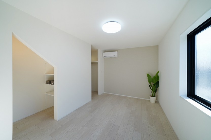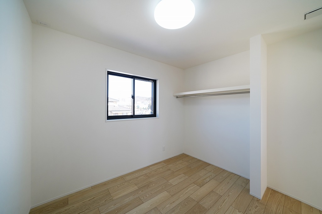 ゆとりのある主寝室。大きなサイズのベッドを置くことも楽々です。家族みんなで川の字になれるそんな空間です。アクセントクロスを淡いグレーにし、落ち着いた空間になるようにデザインしました。ベッドの高さを考えて、コンセントの高さを高めに設置しています。