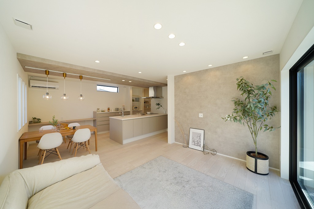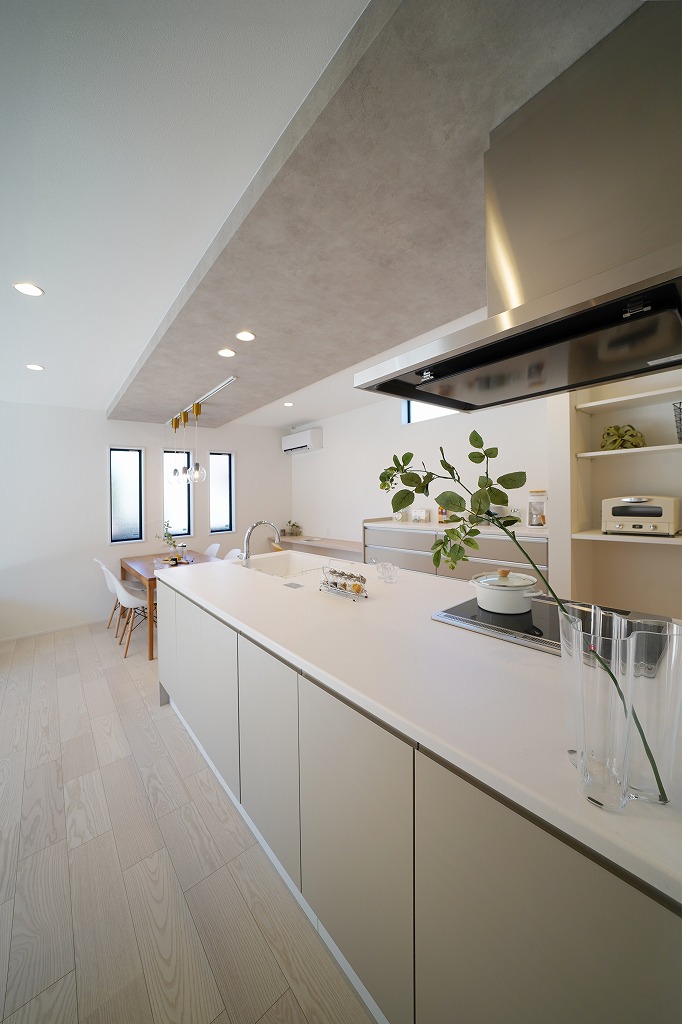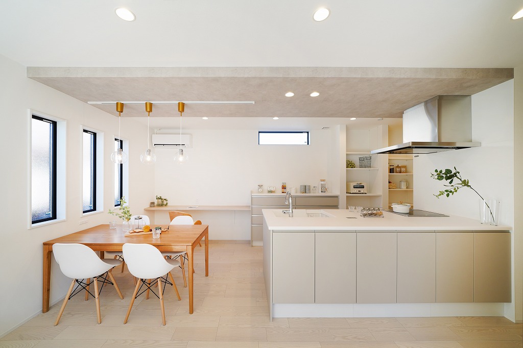 上質で落ち着いた雰囲気を演出したLDKにマットな質感のグレージュカラーを採用したスタイリッシュなキッチンスペース。