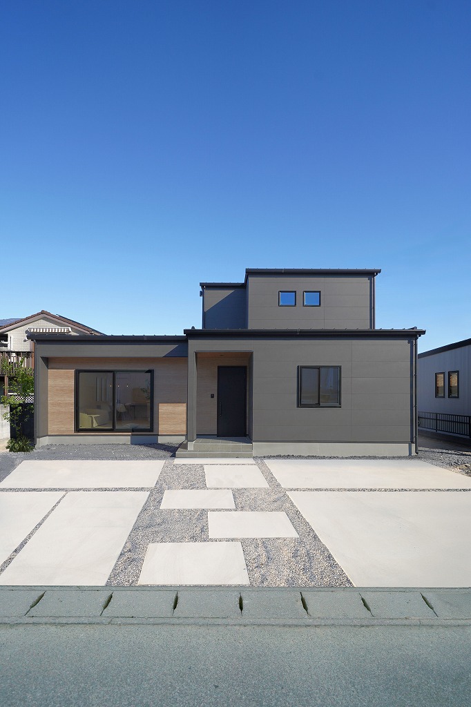 濃いグレーをベースに木目をアクセントに使った都会的な洗練と安らぎを感じらる外観