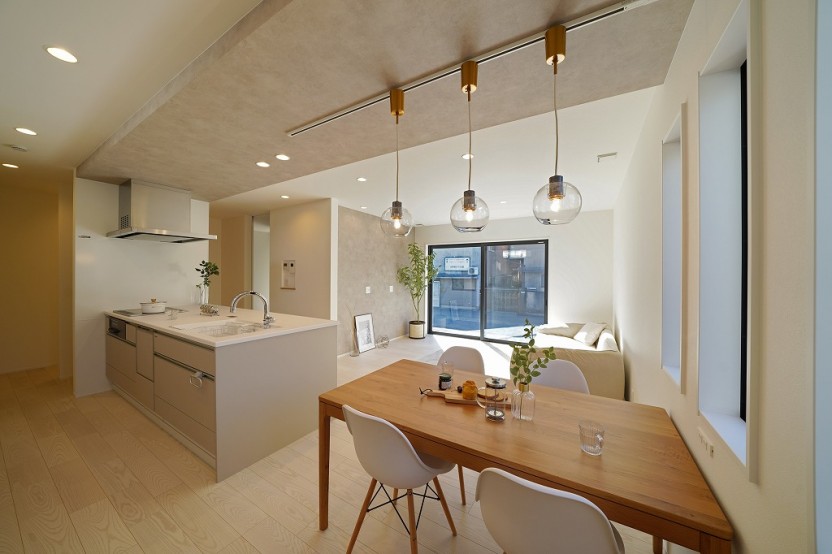 ホワイト×グレーをベースとしたホテルライクデザインのLDK。折下げ天井をグレーの石目調の素材にすることで、上質で落ち着いた雰囲気を演出。グレーの大理石が特長のペンダントライト(標準)は、上品で美しく輝き、おしゃれで高級感あふれる空間に仕上げてくれます。