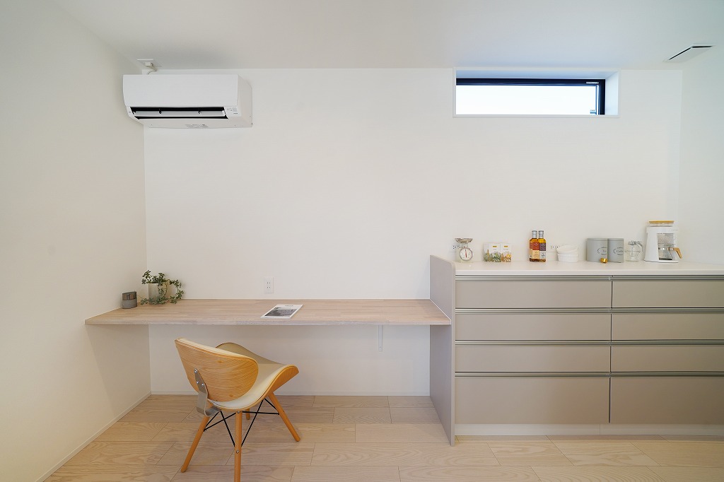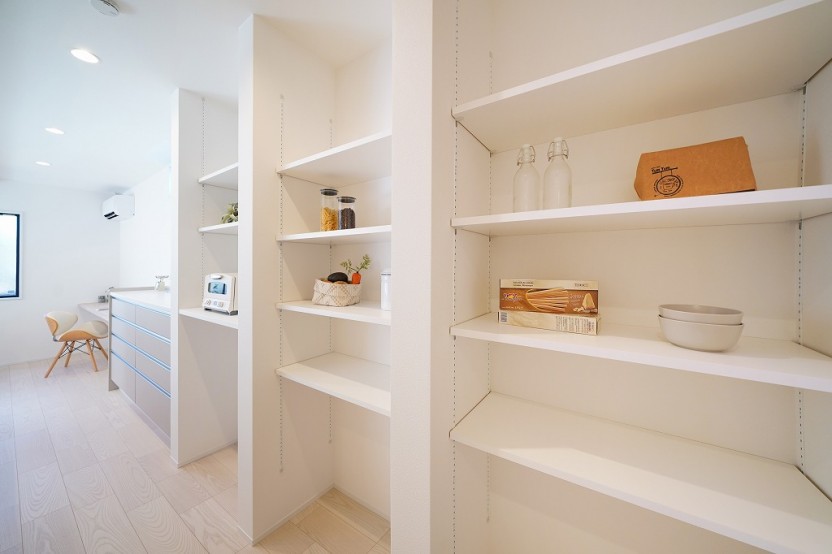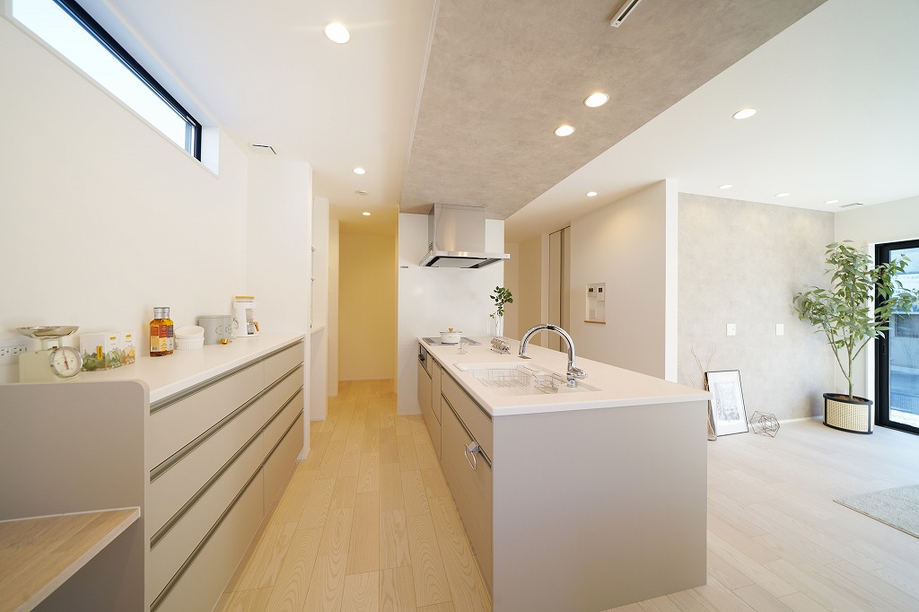 キッチンはマットな質感のグレージュカラーを採用。シルバーの取手と組み合わせることで高級感がアップします。フラット対面キッチンと背面収納の組み合わせは、空間を広く見せるだけでなく、収納力も大幅にアップさせ、生活感も無くせます。