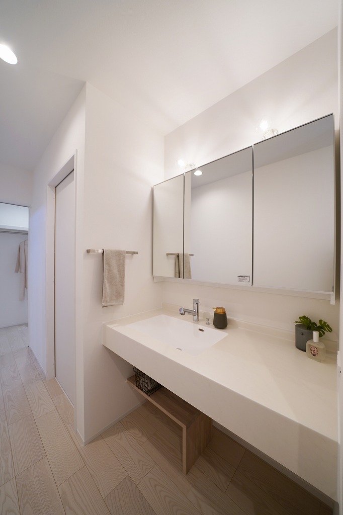 洗面台はアイカスタイリッシュカウンターを採用し、天板をホワイトでまとめてデザインに統一感を持たせました。三面鏡の上のブラケットライトは印象的に輝き、まるでホテルの洗面台のような高級感あるデザインに仕上げました。通路にある洗面スペースは扉で仕切ってはいないですが、洗面台の配置と視線の抜け方を工夫することで、視線が通りにくいようにしました