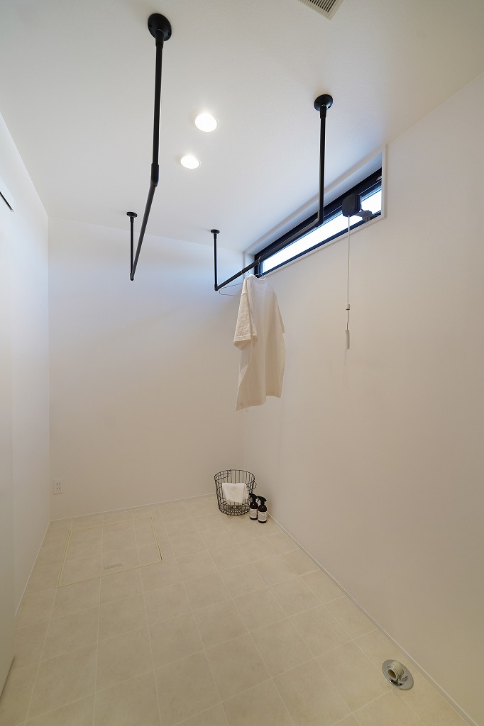 脱衣室&ランドリールーム。ホワイトのクッションフロアは清潔感があり、空間も広いので気持ちよく洗濯できます。収納ボックスの上でコンセントが使えるように位置を高めに設置するなど、生活をイメージして電気配線プランを考えました。