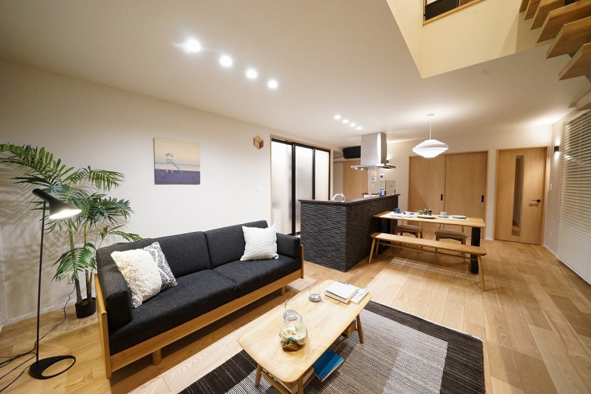 明るく開放感のある空間!!オープンキッチンで家事が楽しくなります。!ナチュラルカラーにポイントの黒で引き締めたコーディネイトでスッキリ感UP