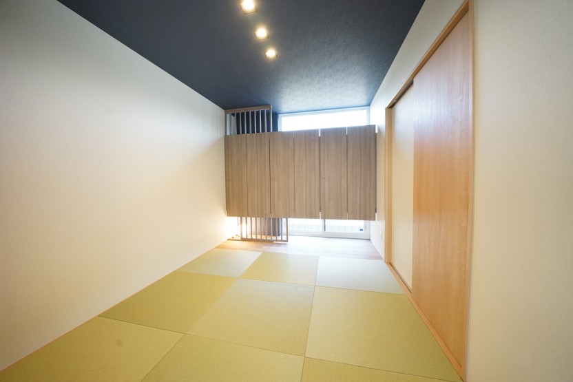 造作家具収納の上下に取った窓から入る明かりがちょうどいい!縁無し畳でモダンな和室。落ち着きます。