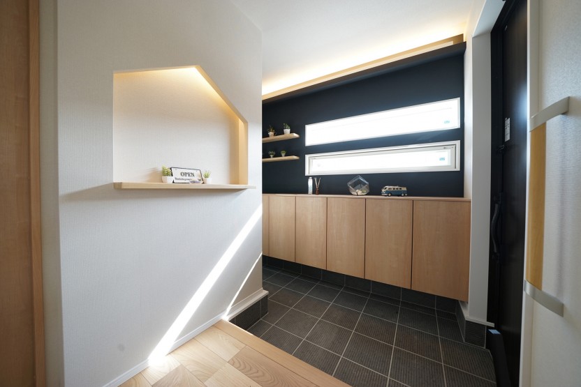 お家の形をしたニッチが印象的な玄関!!間接照明だけで明るくしているので、スッキリした玄関に!!