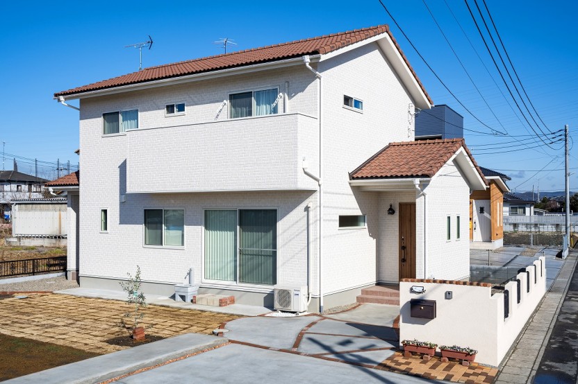 オレンジ色の瓦屋根がおしゃれな南欧風のかわいい外観。