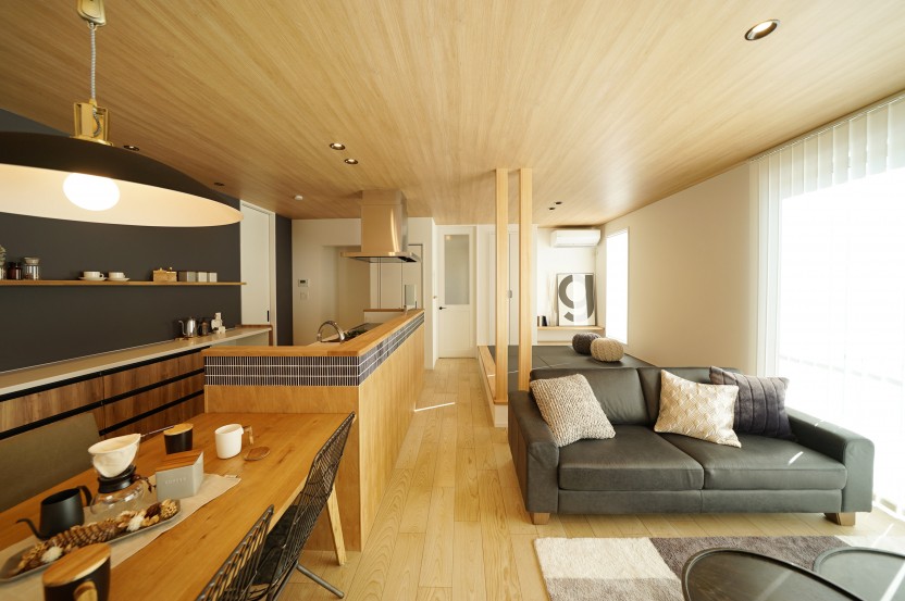 ナラ材の板張り・ノスタルジックな色合いの極細ボーダータイルを合わせた腰壁。かっこいいながらも優しい、空間のアクセントになります。ダイニング脇には大きなスクエア窓を配し、明るい食卓を演出します。