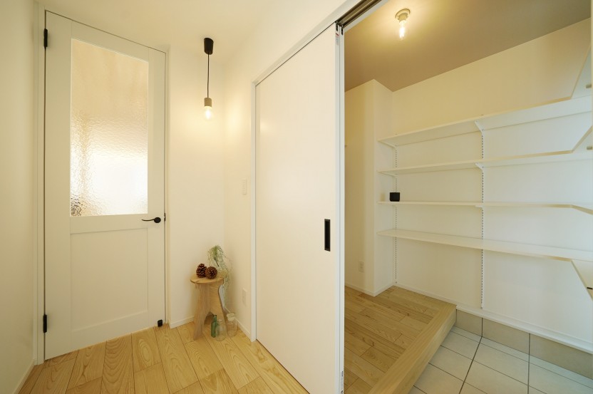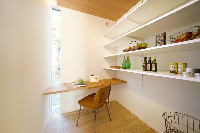 パントリーはキッチン裏のバックヤードとしてたっぷりの収納量で動線もバッチリ!奥様専用のカウンターでほっと一息しながら作業できるスペースです。