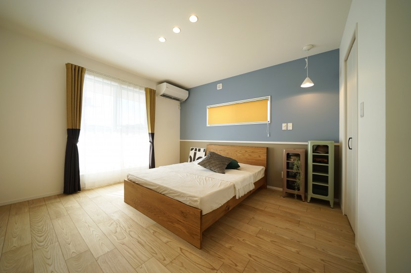 アクセントクロスが印象的なナチュラルテイストの主寝室。間接照明が落ち着いた空間を演出します。天然木フロアーなので温もりを感じることが出来ます。
