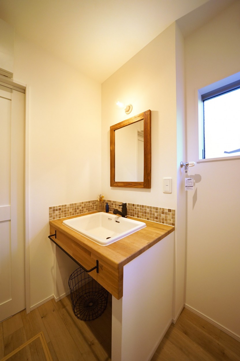 アクセントタイルを使った造作洗面台。明るく優しい色合いに包まれながらお出かけの準備や家事ができます。