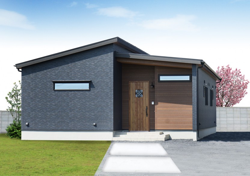 ネイビーをベースに外観と軒天にアクセントで木目を使用したナチュラルモダンの外観。玄関ドアのアイアンのモチーフがかわいらしさをプラスしています。