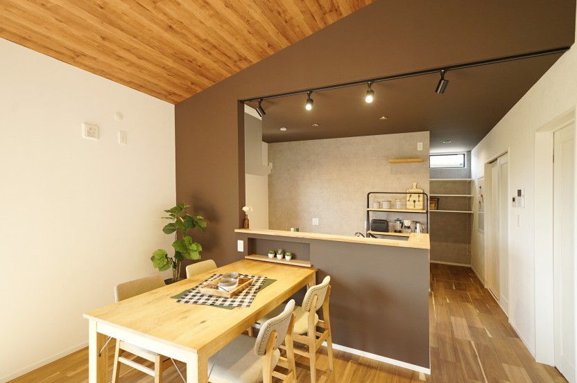 勾配天井が目を惹くLDKは梁もなくスッキリさせ、より広く高く感じられるようになっています。