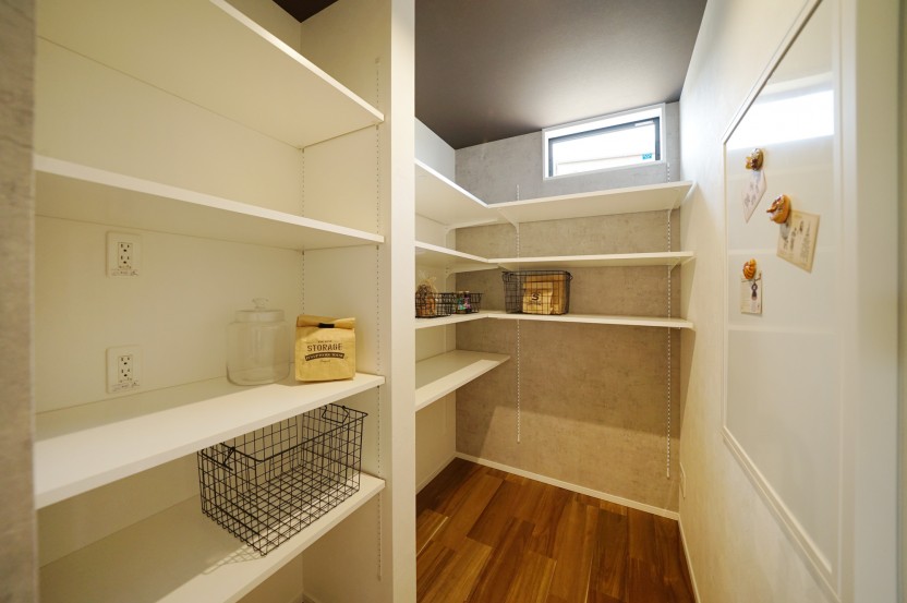 大容量パントリーは食品などを収納するだけでなく、生活感の出る電子レンジやトースターなどの電化製品も置くことができます。