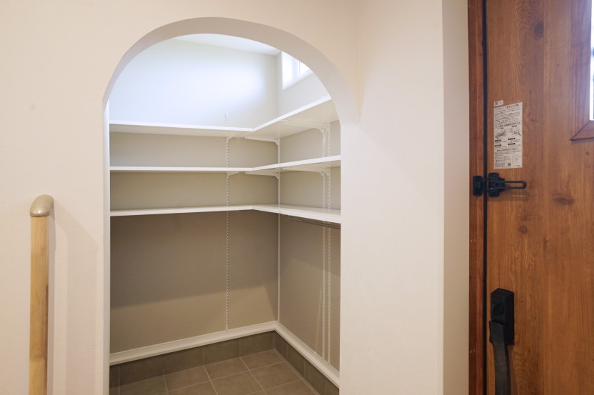 たっぷり収納できるシューズクロークは大きめなベビーカーも対応出来るように入口広めです。棚の下にはパイプも付いているので傘や、お子様のカッパなどを掛けられるスペースになっています。