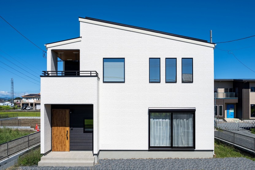 白い外壁が美しく映えるシンプルモダンの外観。
