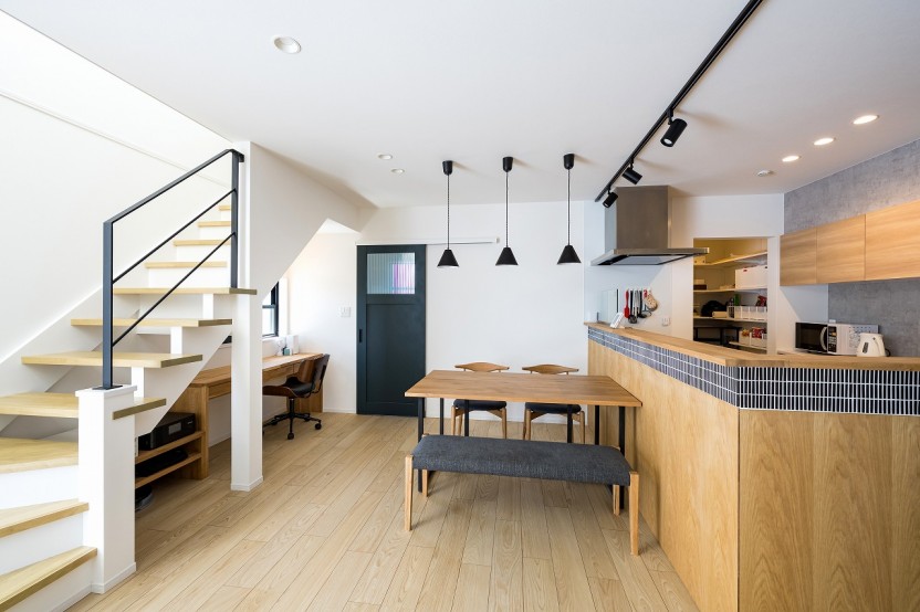 シンプル和モダンのインテリアに統一された趣あるLDK。吹き抜け+リビング階段は1階と2階だけでなく家族の絆を繋ぎます。