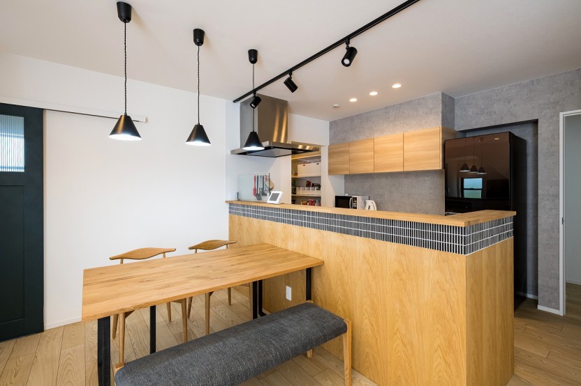 ノスタルジックな色合いの極細ボーダータイルとナラ材の板張りを合わせた腰壁のキッチンスペース。
