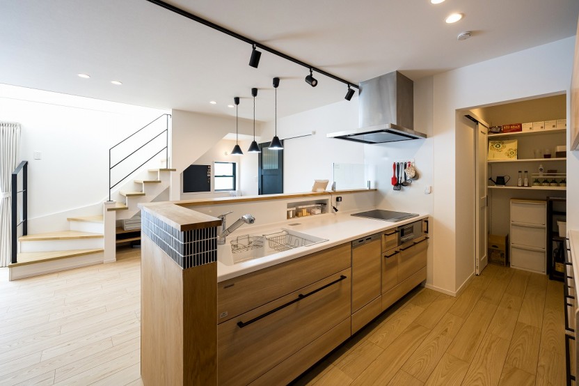 キッチンスペースの奥には大容量のパントリー。パントリー入って左の引き戸を開けると玄関フロアのシューズクロークへと繋がります。