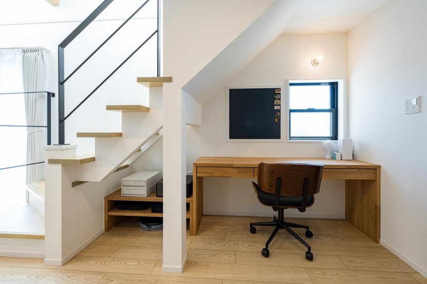 リビング階段の下を有効活用したワークスペース。趣味や仕事まで幅広く活用できます。
