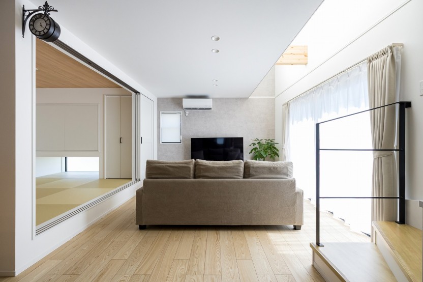 リビングに繋がる和室。引戸を閉めることで個室にする事ができ、客室としても使えます。反対側にある奥の引き戸を開けると室内干しができるランドリールームへと繋がります。