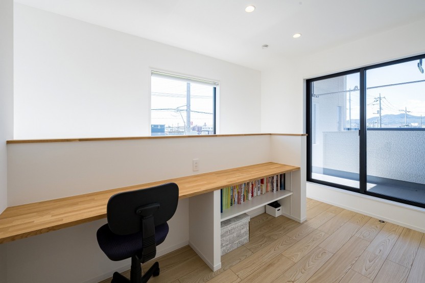 2階ホールにもワークススペースを設置。リビングの吹き抜けに面しているので2階にいながらでも家族とコミニケーションを取る事ができます。